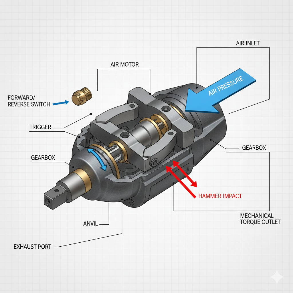 Ang puso ng a pneumatic impact wrench ang air motor nito. Kapag hinila ng user ang gatilyo, pumapasok ang naka-compress na hangin sa tool at nagpapaikot ng rotor. Ang rotor na ito ay konektado sa isang "impact mechanism"—karaniwang isang twin-hammer o rocking-dog na disenyo. Habang umiikot ang rotor, bumubuo ito ng kinetic energy. Kapag ang resistensya ng bolt ay naging mas mataas kaysa sa umiikot na puwersa ng motor, ang mga panloob na martilyo ay tumama sa output shaft (ang anvil), na naghahatid ng isang biglaang, napakalaking pagsabog ng puwersa ng pag-ikot. Nangyayari ito nang daan-daan o kahit libu-libong beses kada minuto.